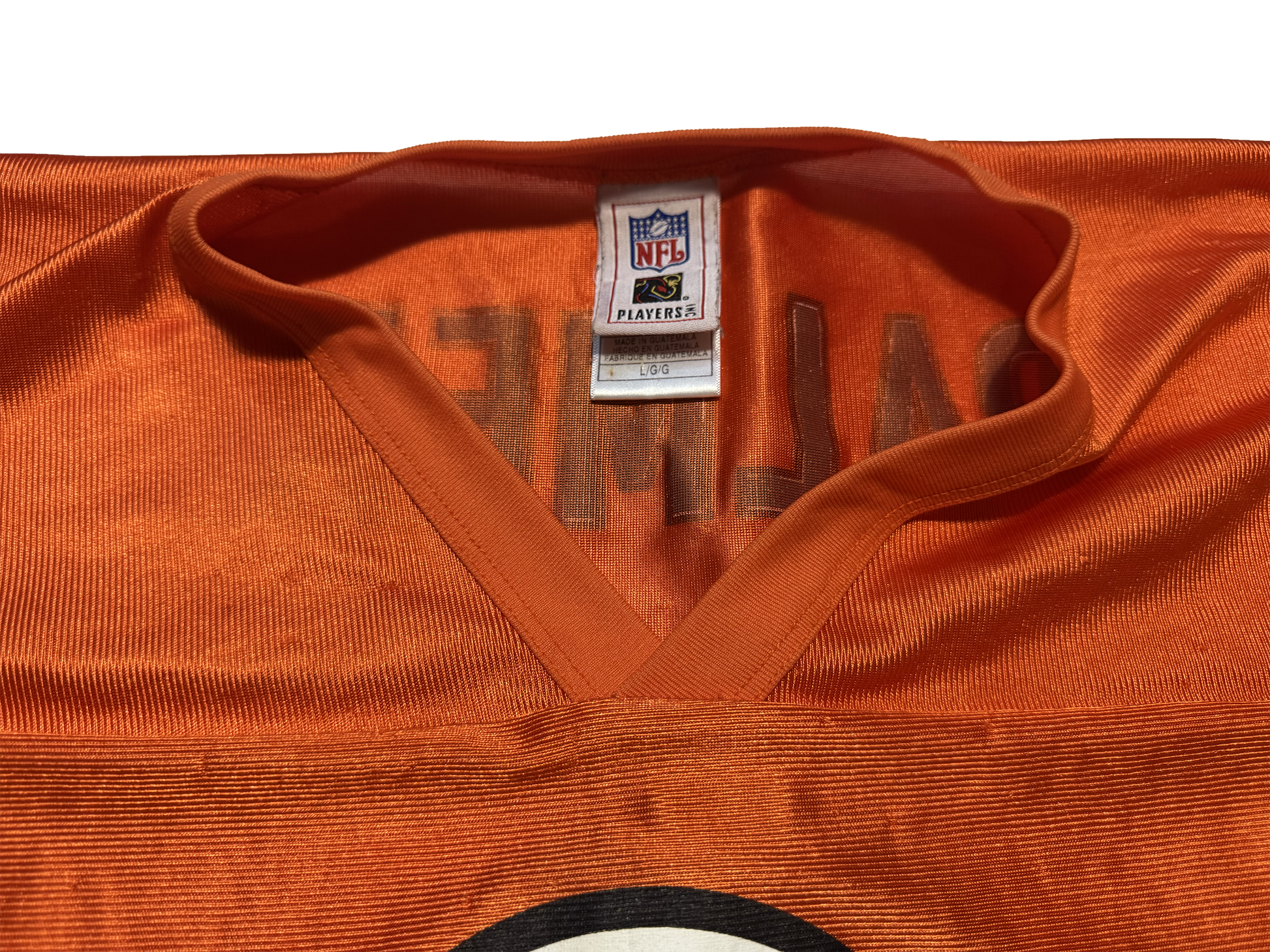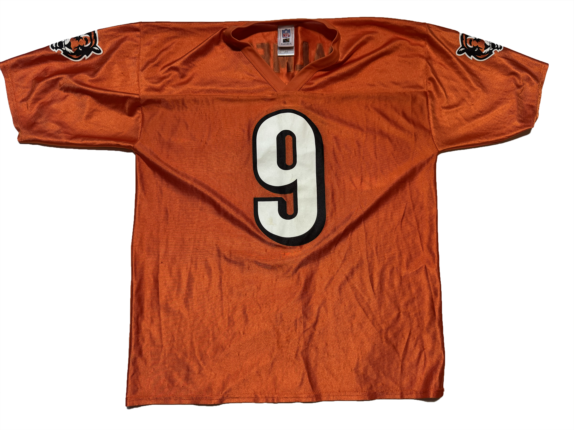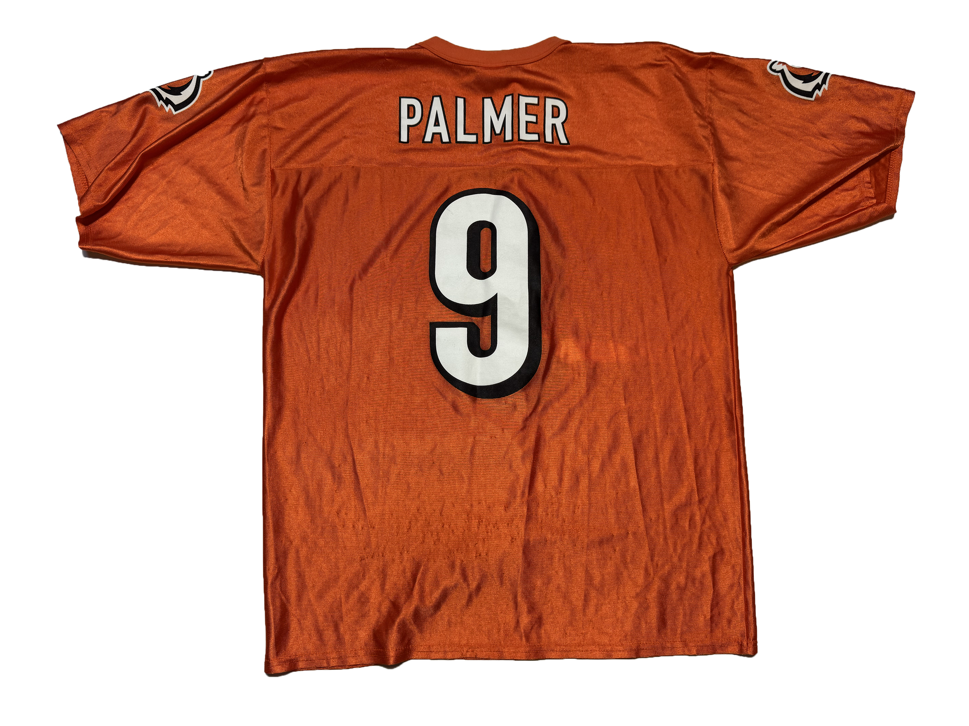 This Carson Palmer Cincinnati Bengals jersey from the mid 2000s was a style worn in practice. This large size jersey features Bengals logos on both sleeves as well as Palmer's #9 on the front and back along with his name.