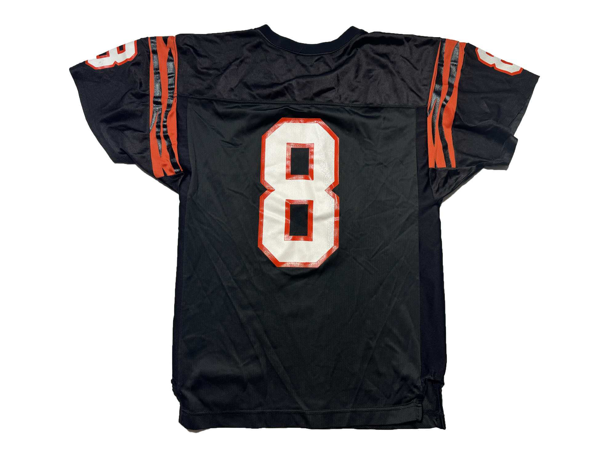 NICE 1990s Cincinnati Bengals jersey with tiger stripes on the sleeves. The #8 is on both sleeves, the front picture did not take the best. This was the jersey of QB Jeff Blake in the 90s and is a Wilson brand jersey size 46 (small).