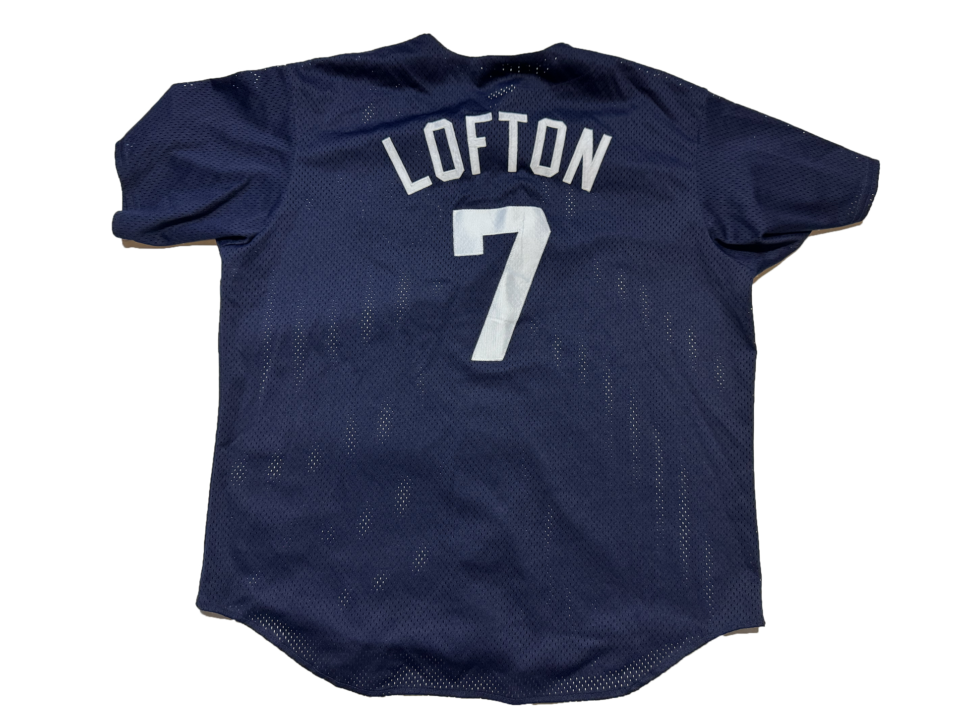 This Majestic brand Cleveland Indians jersey features a patch of Chief Wahoo on the front and Kenny Lofton's #7 stitched on the back. This style was worn by the Indians in batting practice in the 2000s.